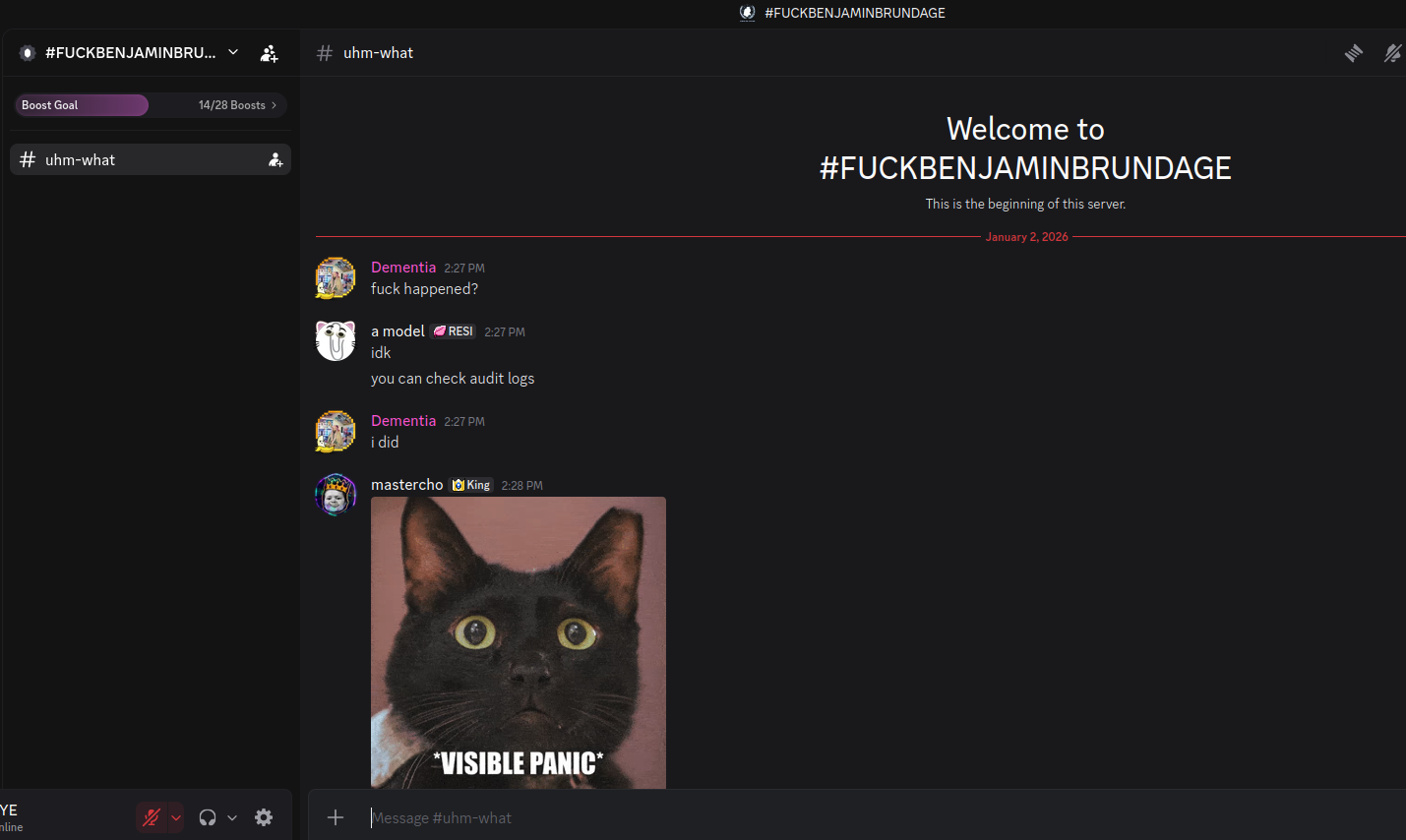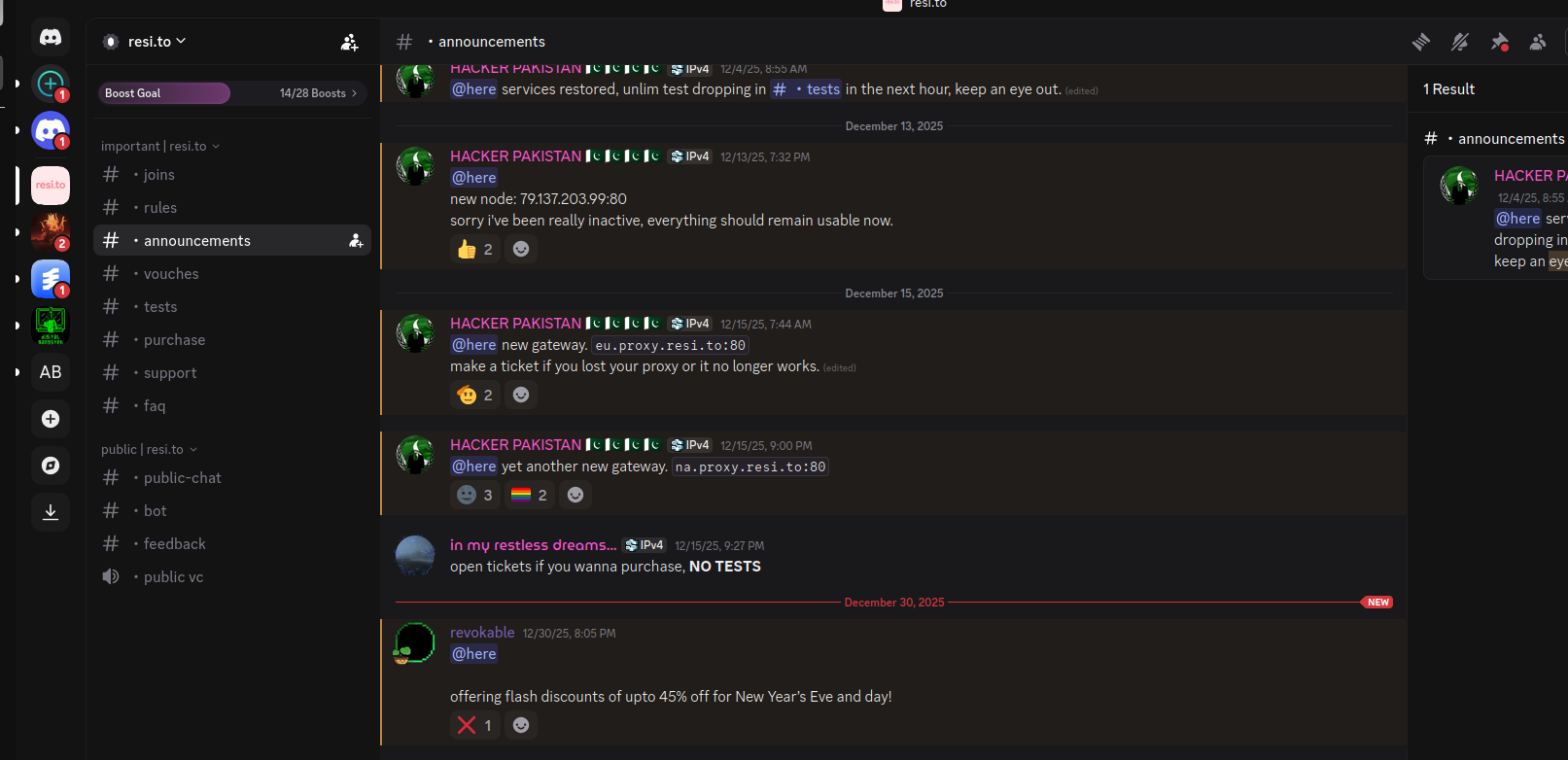 On January 2 — just hours after our story on Kimwolf was published — the historical chat records on resi[.]to were erased without warning and replaced by a profanity-laced message for Synthient’s founder. Minutes after that, the entire server disappeared.