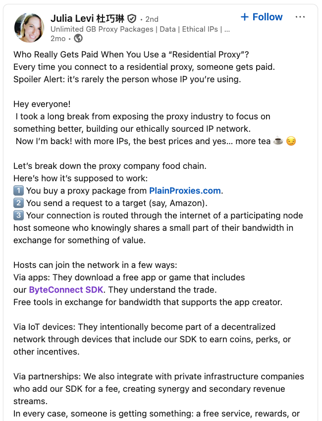 A post from the LinkedIn page of Plainproxies Chief Revenue Officer Julia Levi, explaining how the residential proxy business works.