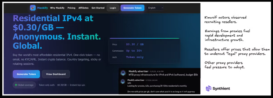Synthient’s January 2 report said another proxy provider heavily involved in the sale of Kimwolf proxies was Maskify, which currently advertises on multiple cybercrime forums that it has more than six million residential Internet addresses for rent.