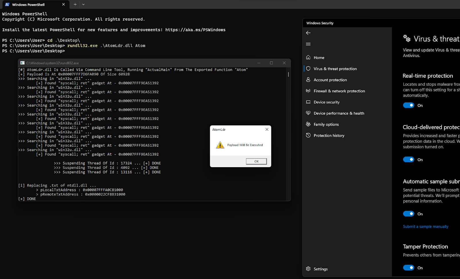 PayloadConfig.pc file, that contains the encrypted payload, and its encrypted key and iv.PayloadConfig.pc file will then replace this in the AtomLdr project.AtomLdr project as x64 Release.AtomLdr.dll using rundll32.exe, running Havoc payload, and capturing a screenshotAtomLdr.dll's Import Address TablePayloadBuilder.exe, to encrypt demon[111].bin - a Havoc payload fileAtomLdr.dll using rundll32.exe